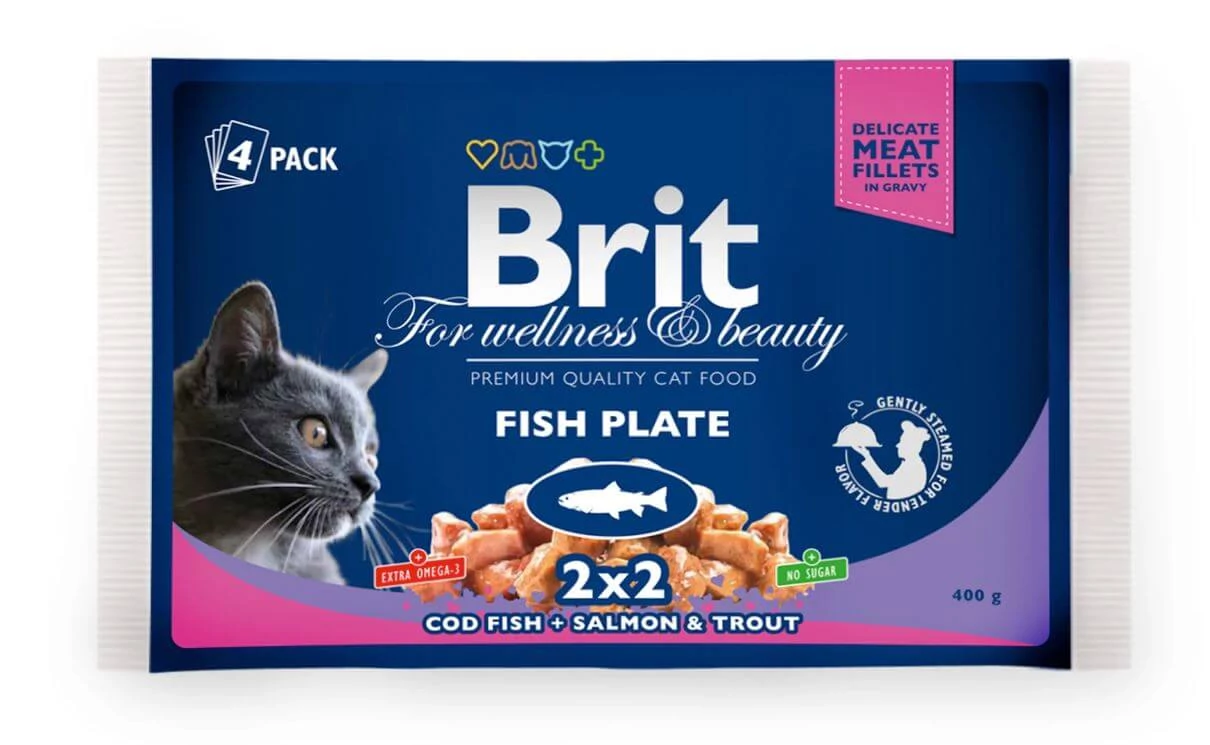 A Brit Premium Cat Pouches Fish Plate ínycsiklandó nedveseledel felnőtt macskáknak.