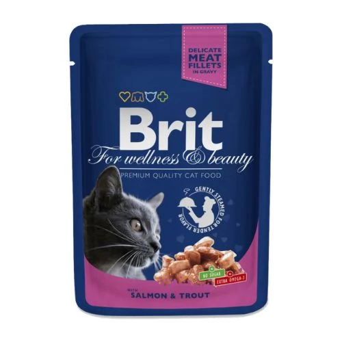 A Brit Premium Cat Pouches with Salmon & Trout egy ínycsiklandó nedveseledel felnőtt macskáknak.