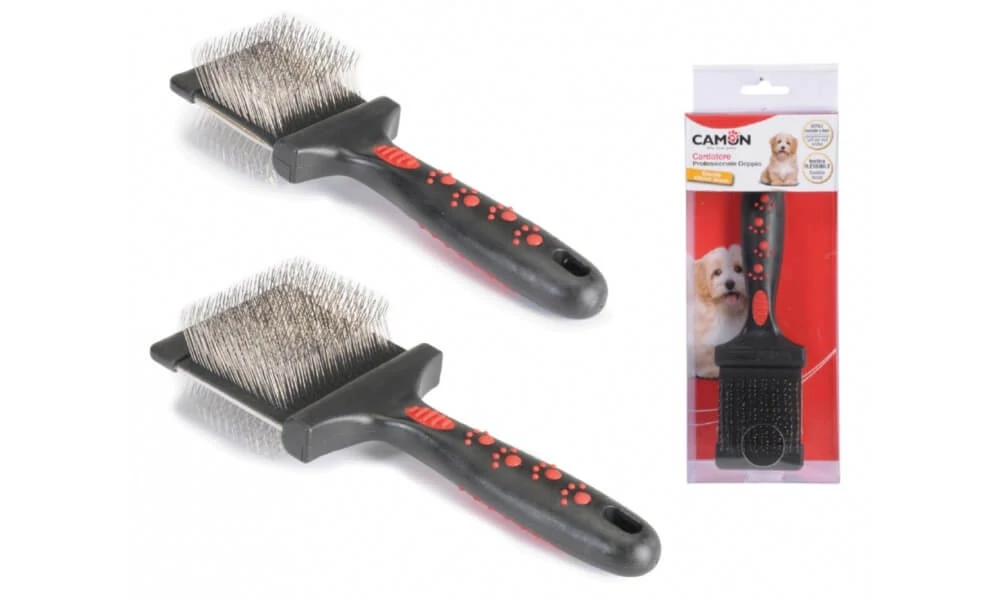 Kétoldalú, hajlított sörtékkel rendelkező bontókefe a kutyusuk szőrzetének ápolásához.