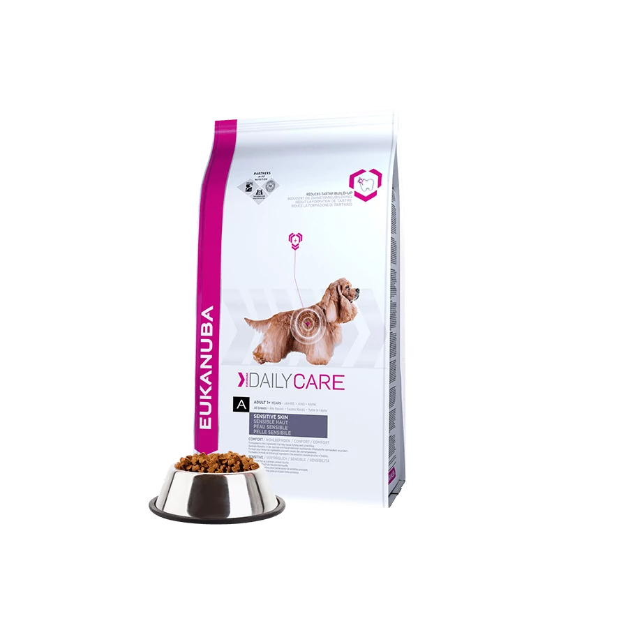 Az Eukanuba Daily Care Sensitive Skin egy ízletes teljes értékű száraztáp érzékeny bőrű felnőtt kutyáknak.
