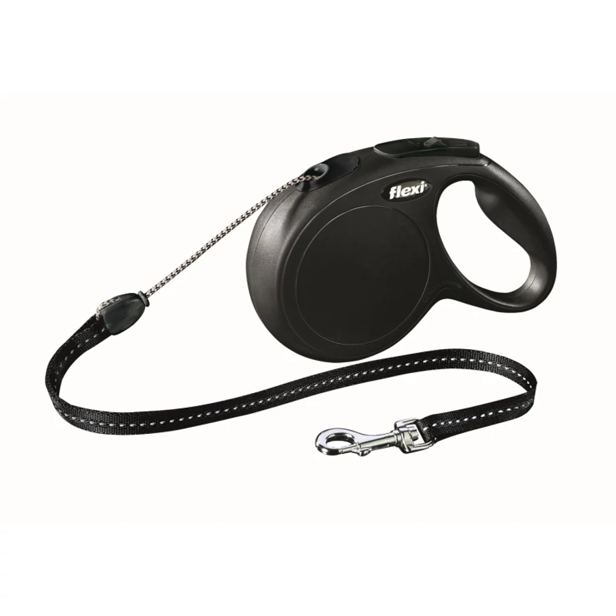 Flexi póráz - Flexi Classic M 8 méteres zsinóros póráz Kutyáknak 20 kg testsúlyig. - színes fényvisszaverős kötél - krómozott karabiner - bőr csatlakozás a karabinernél. A kötél végén lévő szalag megakadályozza, hogy a karabinerig feltekeredjen a kötél és sérülést okozzon a műanyag ház.