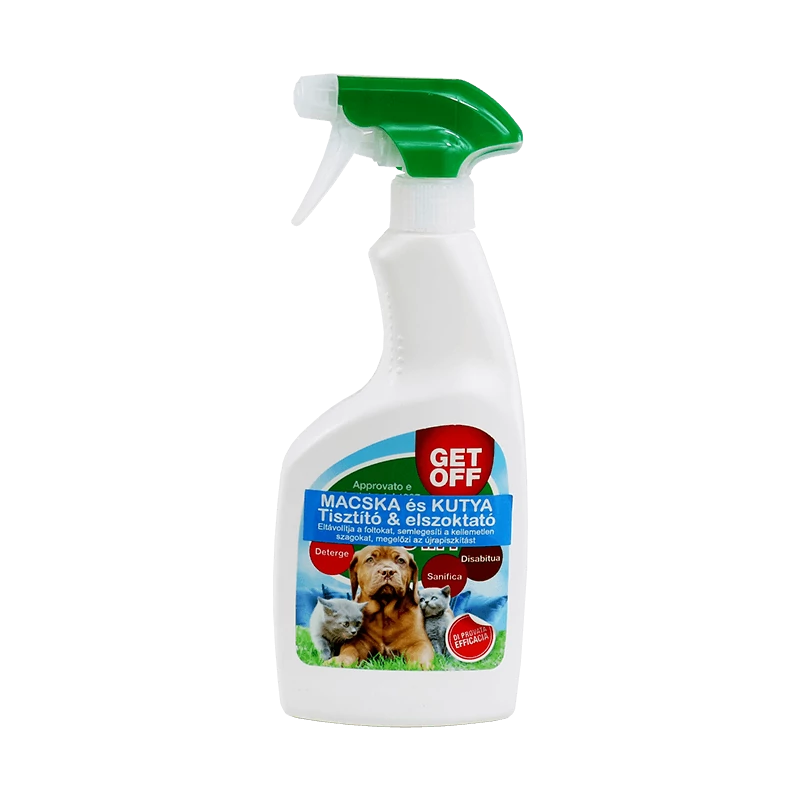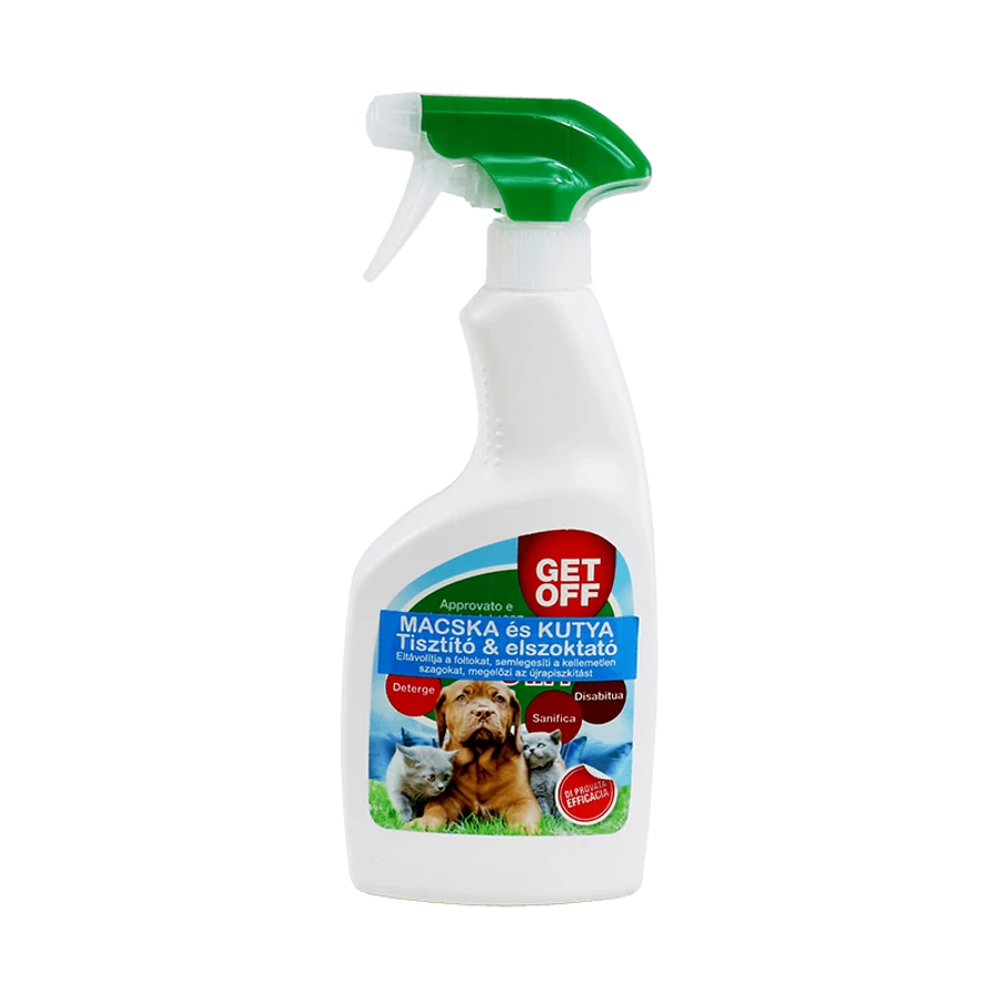 A Get Off Tisztító és elszoktató spray megtisztítja a házi kedvenc által beszennyezett területet, majd a további piszkitás megelőzése érdekében semlegesíti a vizelet szagát és eltávolítja a keletkezett foltokat.