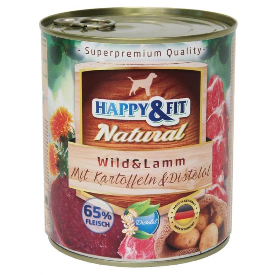 A Happy&Fit Natural konzerv vadhúsokkal, bárányhússal, burgonyával és sáfrányos szekliceolajjal, kizárólag természetes összetevők felhasználásával, 65%-os hústartalommal készült felnőtt kutyák számára, gabonamentesen.