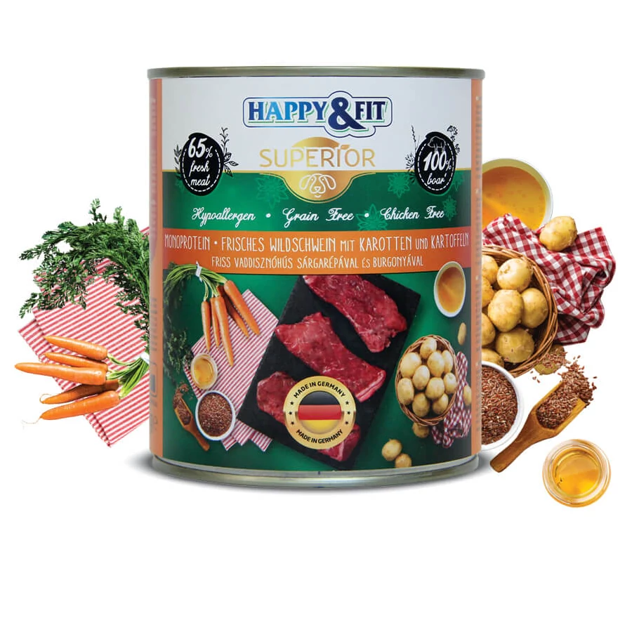 A Happy&Fit Superior 100% Monoprotein - Friss vaddisznóhússal, sárgarépával és burgonyával készült termékünk a gabona- és baromfifélék teljes mellőzésével, természetes összetevők felhasználásával készül.