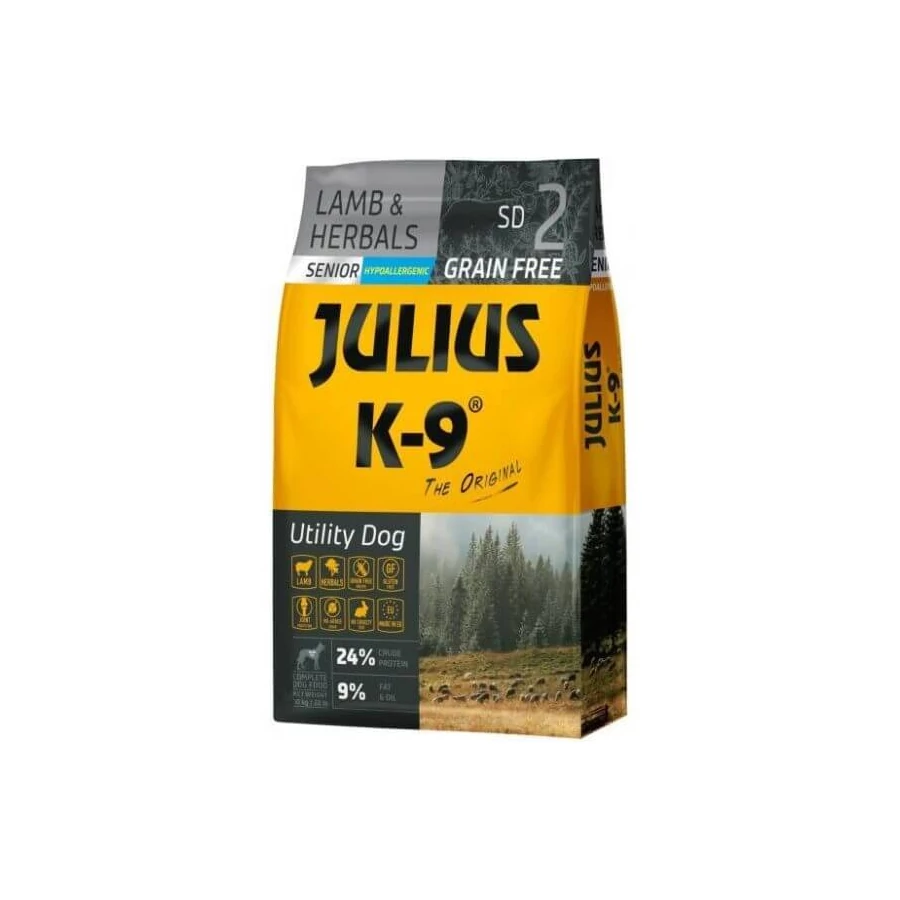 A Julius-K9 GF Hypoallergenic Senior Lamb & Herbals egy ízletes hipoallergén táp bárányhússal idős kutyáknak.