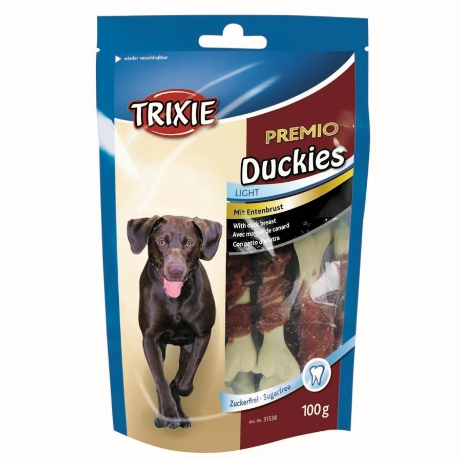 A Trixie Jutalomfalat Premio Duckies Light 100g egy prémium minőségű kiegészítő eledel, melyet kifejezetten kutyák számára terveztek. A termék alapja a 70%-os kacsamell, melyet burgonya keményítő, szója fehérje, kálcium por, glicerin, pálma olaj és só egészít ki.