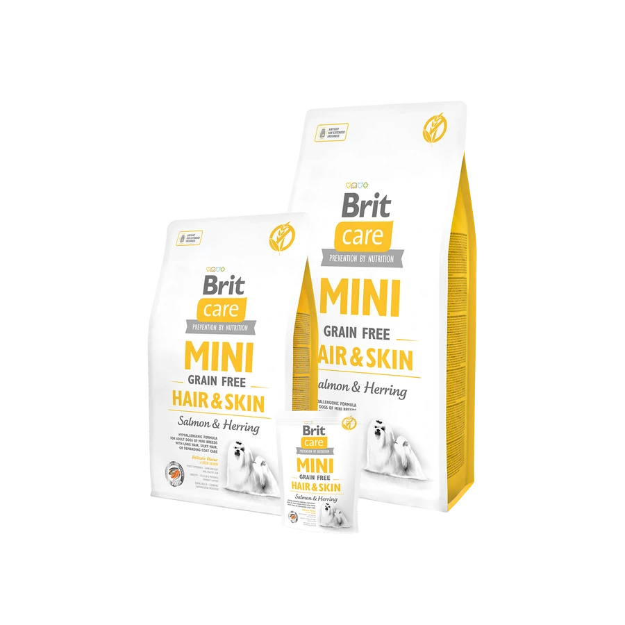 A Brit Care Mini Hair and Skin egy ízletes, teljes értékű száraztáp kistestű felnőtt kutyusok számára.