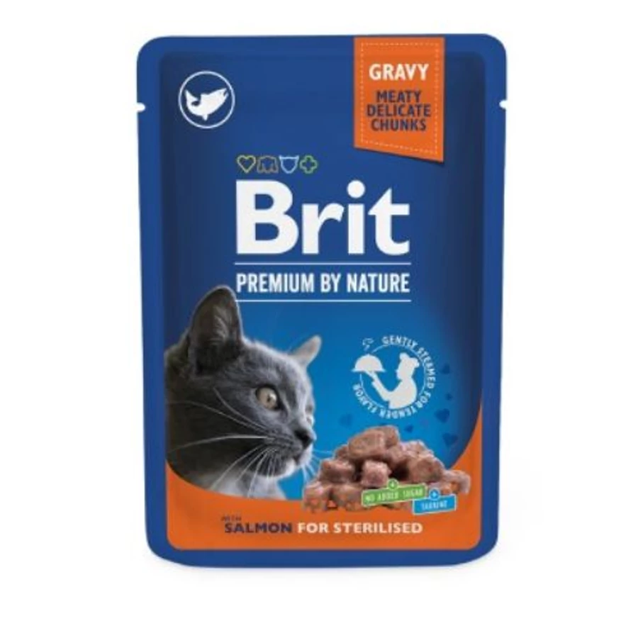 Brit Premium Cat Pouches Salmon for Sterilised egy ínycsiklandó nedveseledel felnőtt macskáknak.