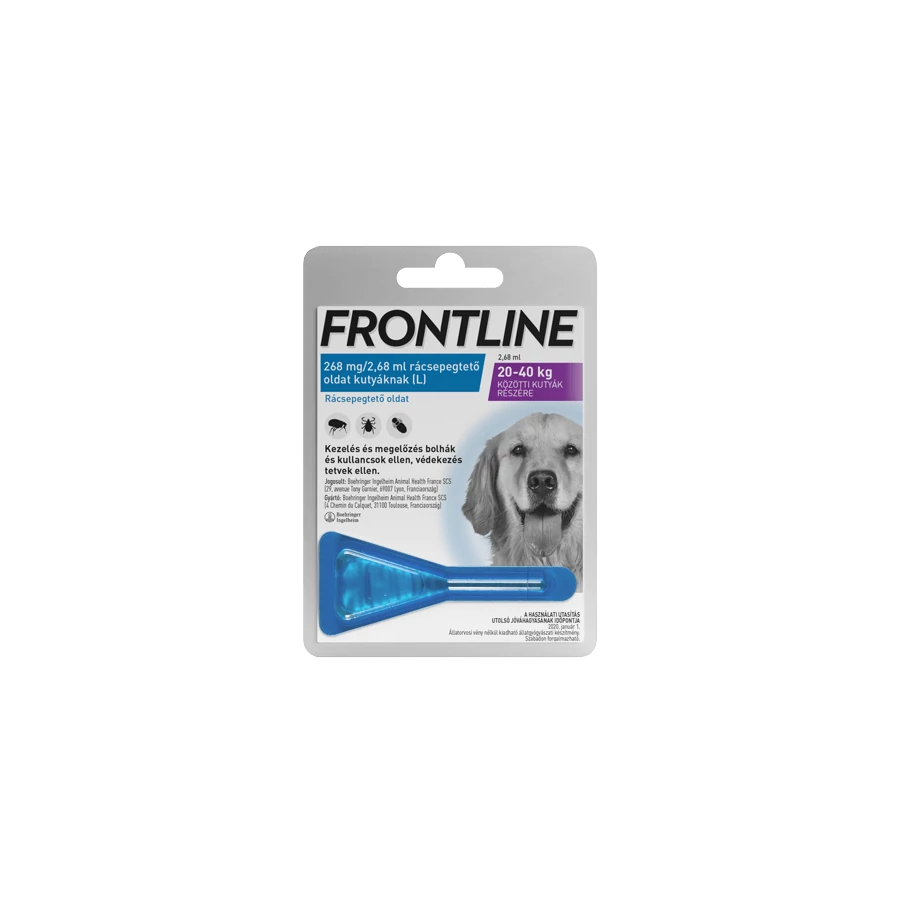 Frontline spot on kutya L bolha és kullancs elleni rácsepegtető oldat nagy testméretű kutyusoknak. Egy 20-40 kg testtömegű kutyának egy 2,68 ml-es pipetta tartalma ajánlott.