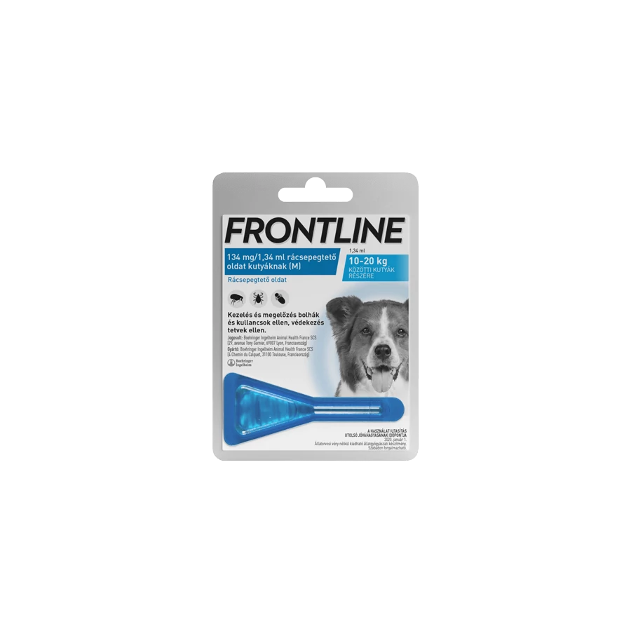 Frontline spot on kutya M bolha és kullancs elleni rácsepegtető oldat nagy testméretű kutyusoknak. Egy 10-20 kg testtömegű kutyának egy 1,34 ml-es pipetta tartalma ajánlott.