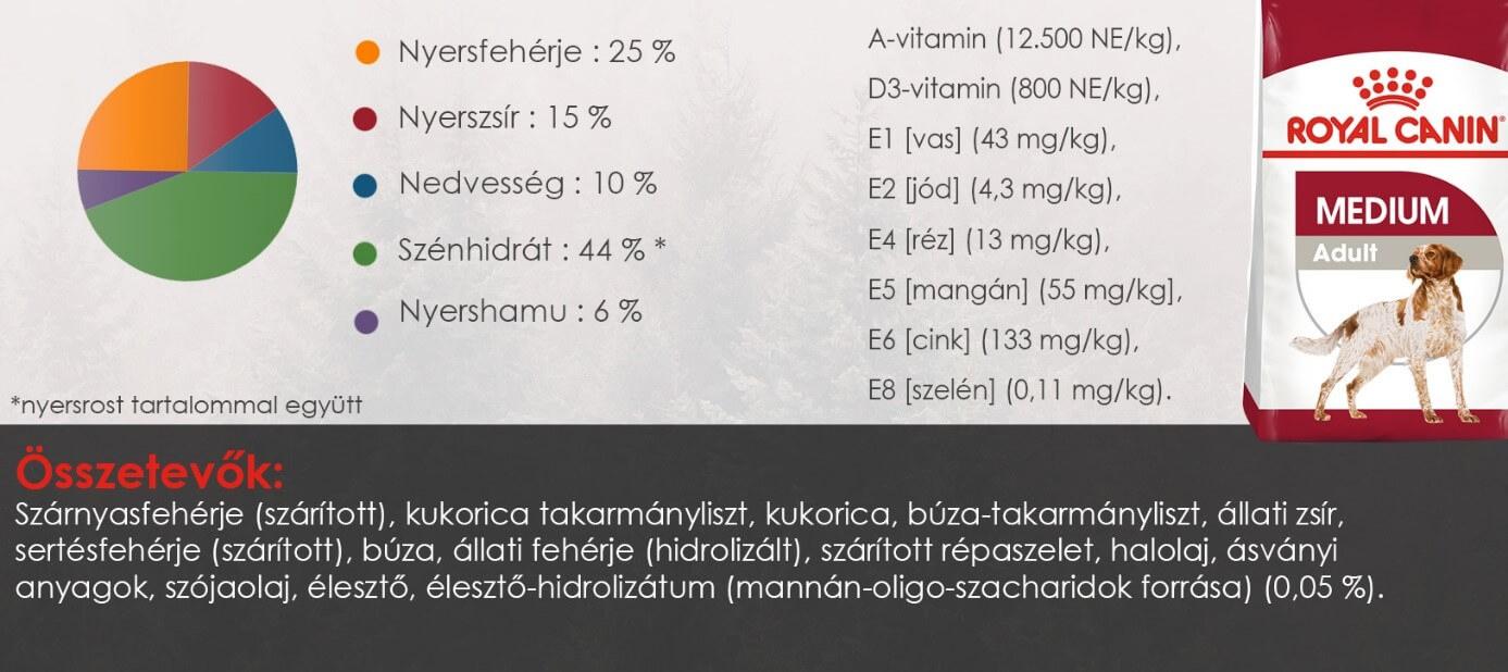 Analitikai összetevők: fehérje:23.0 %, nyerszsír:13.0 %, nyersrost:1.5 %, hamu: 7.5 %