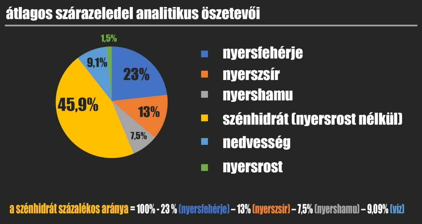 Ha tehát ezek százalékait összeadjuk, és kivonjuk a 100%-ból, megkapjuk, hogy hány % az eledel szénhidrát tartalma.
