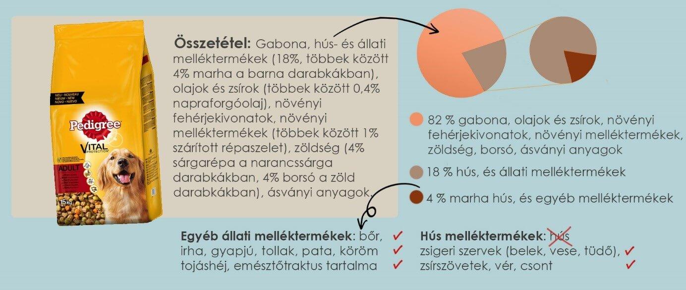 A kereskedelmi forgalomban kapható, önmagát 100%-ban teljesértékűnek tituláló népszerű kutyatáp összetevőit: