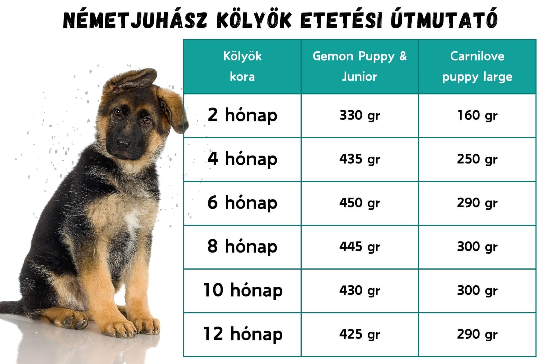 Három hónapos koráig naponta legalább háromszor-négyszer kis, egyenlő adagokra elosztva kapjon enni a kiskutya. Ezután hat hónapos koráig elég már csak kétszer-háromszor etetni. Fél éves kora után pedig elég a napi egyszeri vagy két alkalommal történő etetés.