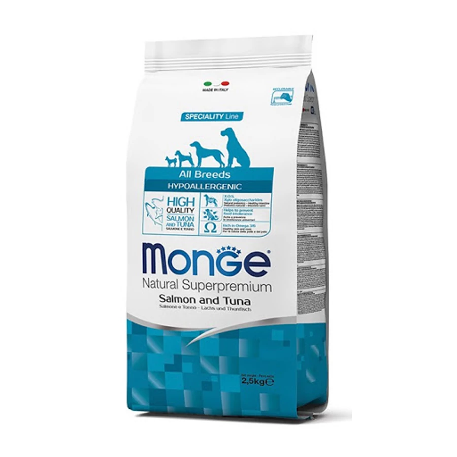 A Monge All Breed Adult Hypoallergenic Salmon & Tuna egy teljes értékű, lazacos száraztáp felnőtt kutyák számára.