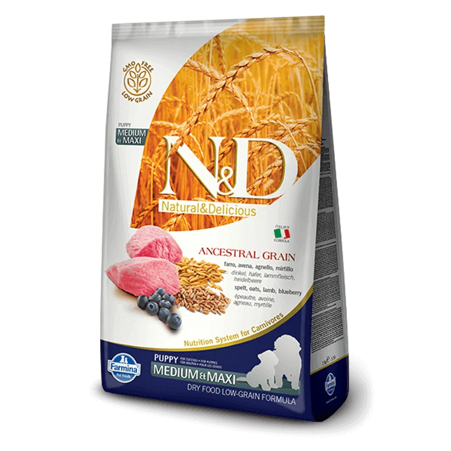 N&D Dog Grain Free bárány&áfonya sütőtökkel puppy medium/maxi 12kg teljes értékű, gabonamentes kutyatáp báránnyal, sütőtökkel és áfonyával közepes és nagytestű kölyökkutyák, valamint vemhes és szoptatós szukák részére.