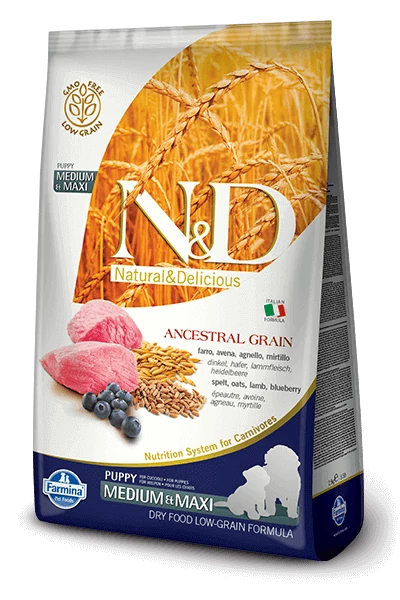 Az N&D Ancestral Grain bárány, tönköly, zab&áfonya egy teljes értékű ízletes száraztáp közepes- és nagytestű kölyök kutyák számára.