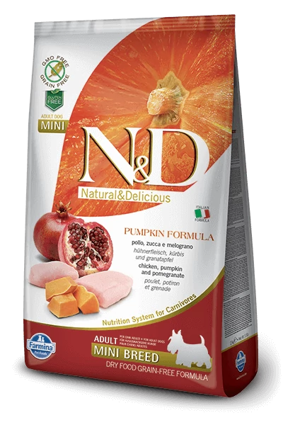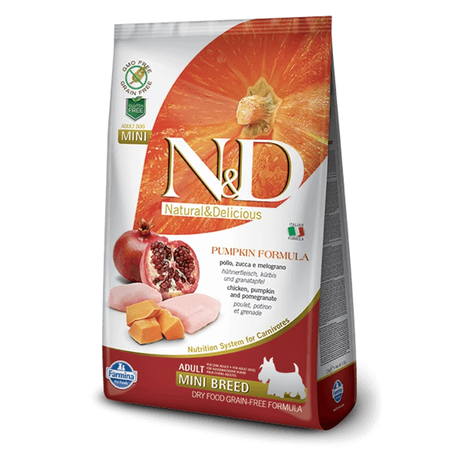 Az N&D Grain Free csirke&gránátalma sütőtökkel egy teljes értékű ízletes száraztáp kistestű felnőtt kutyák számára.