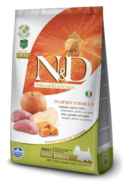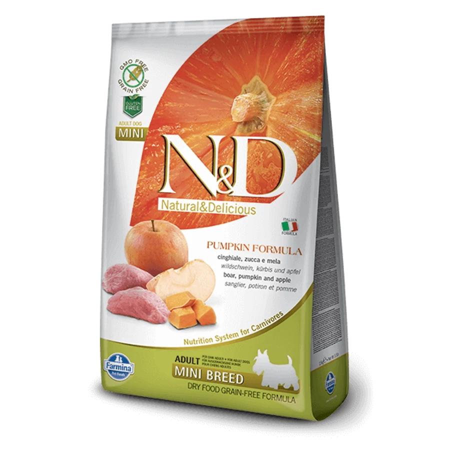 Az N&D Grain Free vaddisznó&alma sütőtökkel egy teljes értékű ízletes száraztáp kistestű felnőtt kutyák számára.