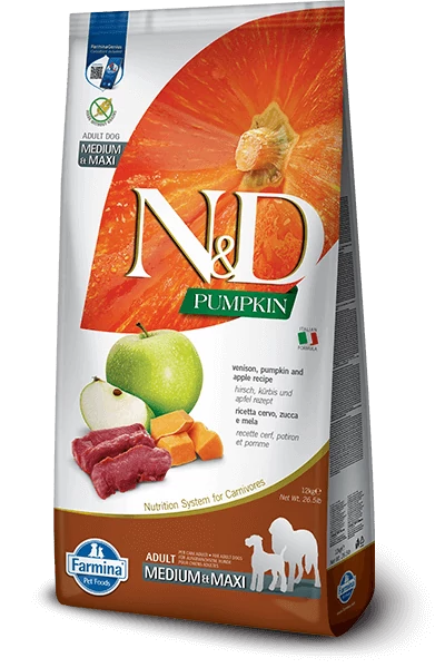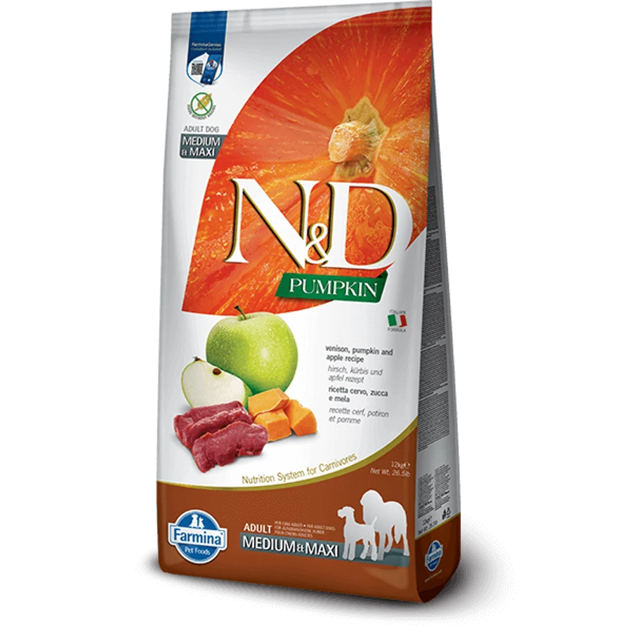 N&D Dog Grain Free vaddisznó&alma sütőtökkel adult medium/maxi 12kg teljes értékű, gabonamentes kutyatáp, közepes és nagy testméretű felnőtt kutyáknak, vaddisznóval, sütőtökkel és almával.