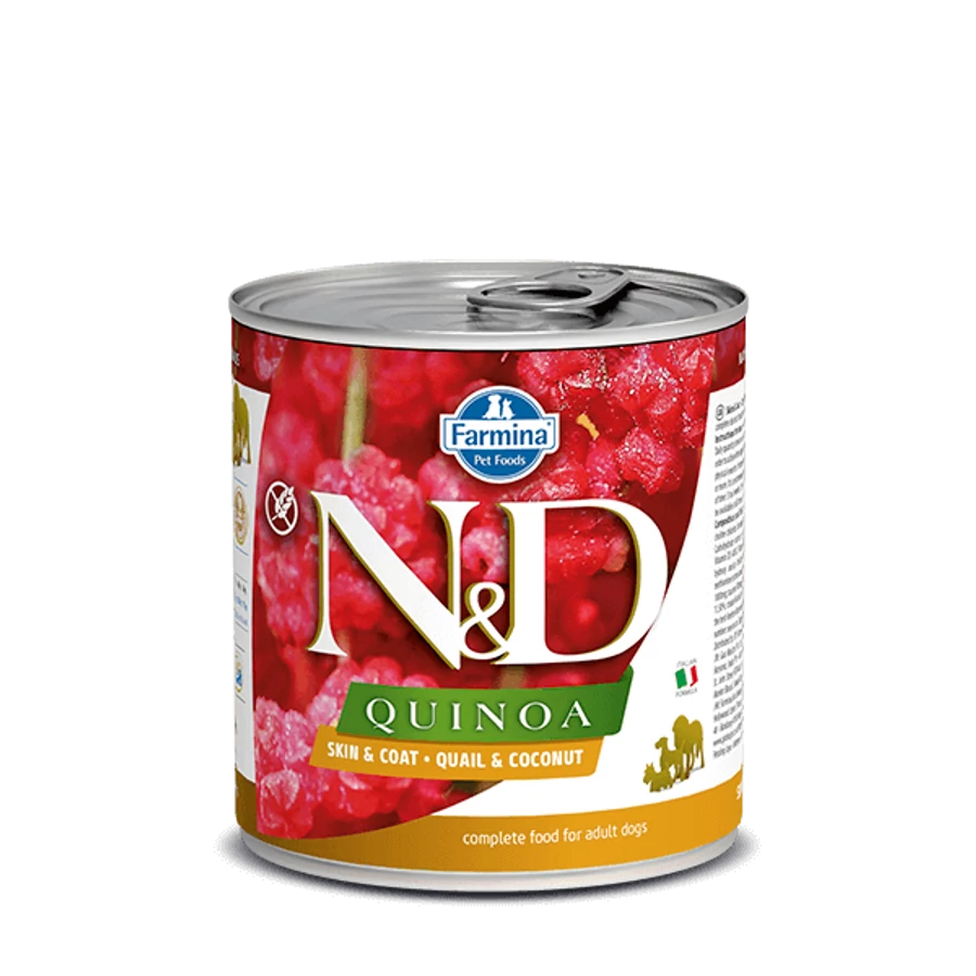 Az N&D Dog Quinoa konzerv egy teljes értékű nedveseledel felnőtt kutyáknak, fürjjel és kókusszal.