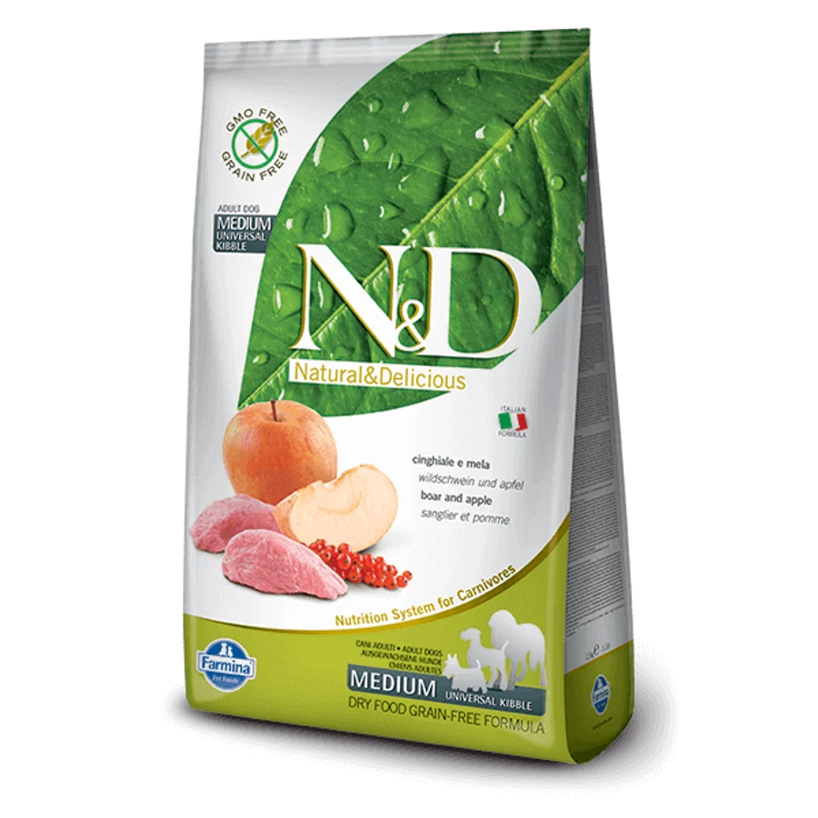 N&D Dog Grain Free vaddisznó&alma sütőtökkel adult medium/maxi 12kg teljes értékű, gabonamentes kutyatáp, közepes és nagy testméretű felnőtt kutyáknak, vaddisznóval, sütőtökkel és almával.