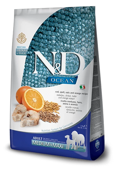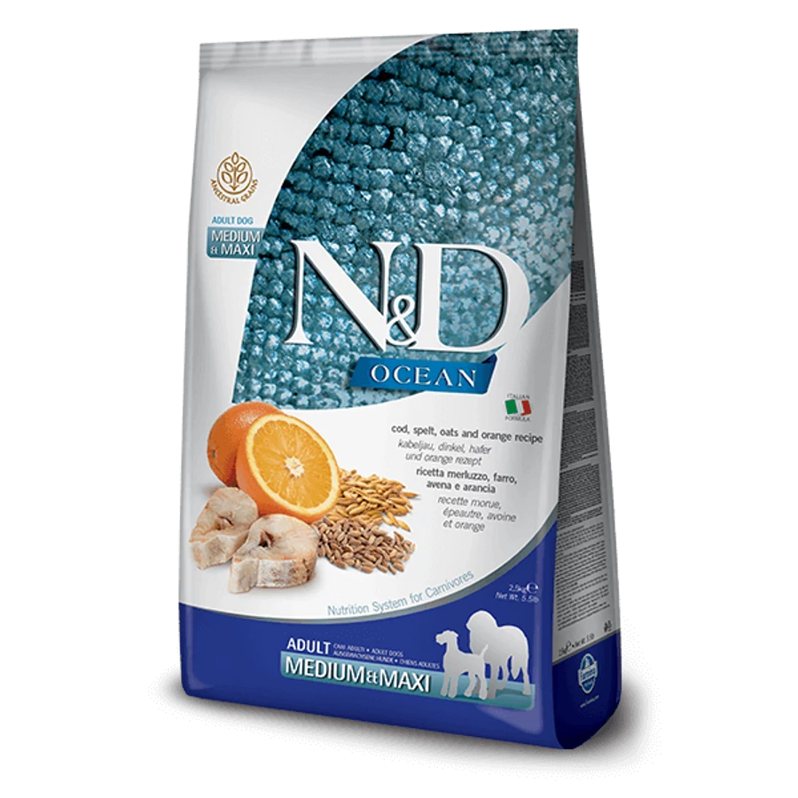 Az N&D Ocean Low Grain tőkehal&narancs egy teljes értékű ízletes száraztáp közepes- és nagytestű felnőtt kutyák számára.