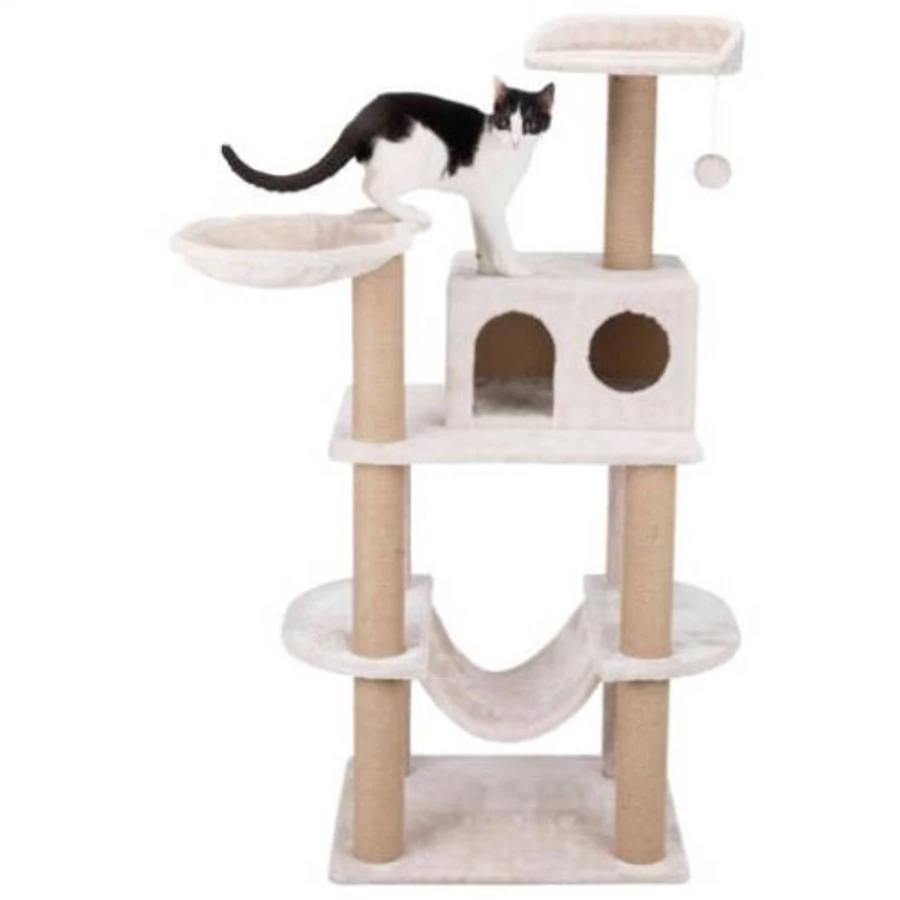 Az oszlopok tetején plüssel borított fekvőhelyek kaptak helyet, emellett egy kényelmes, puha plüss odú is található a bútoron, amely tökéletes búvó- és pihenőhelyet biztosít a cicák számára.